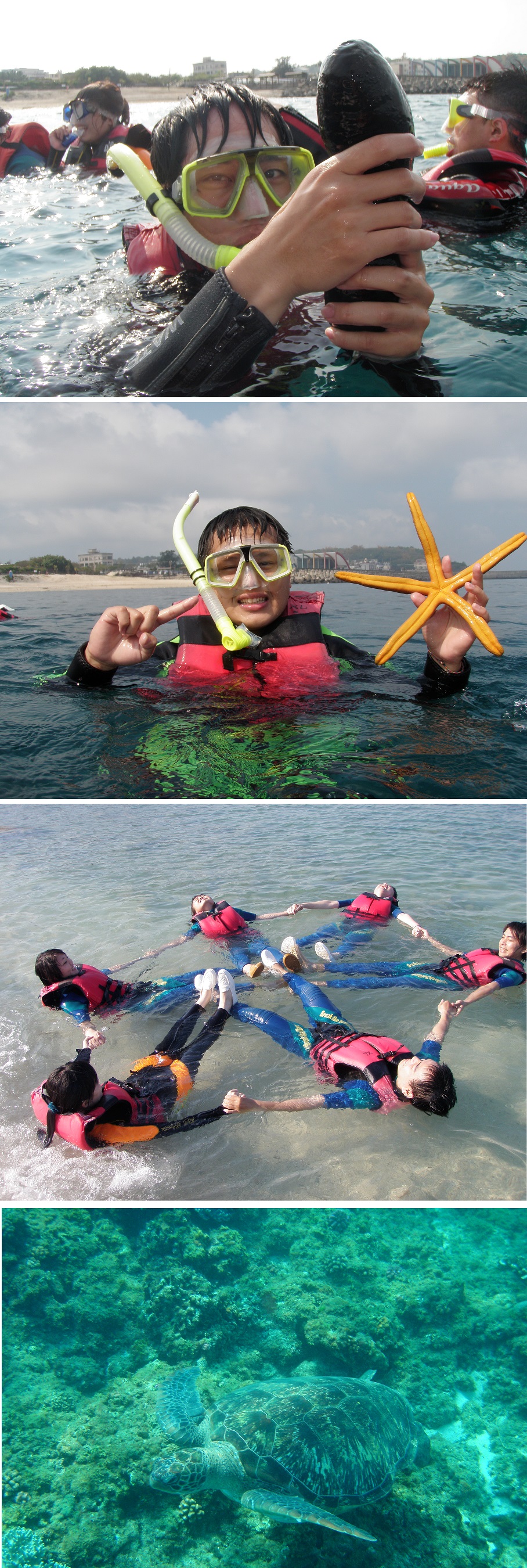 ●參加浮潛或水上活動時,請注意安全,未穿妥救生衣請勿下水,接受浮潛老師之講解,並於岸邊練習使用呼吸面具方得下水,並請留意安全教練位置、勿單獨遊玩或超越安全警戒線。